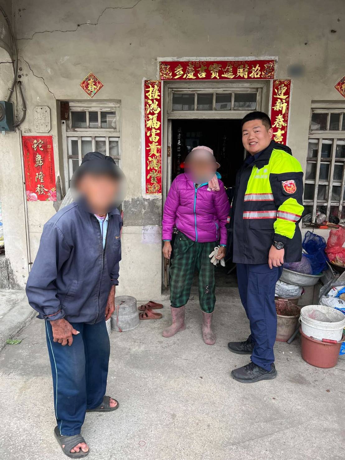 員警迅速趕抵現場,發現有一名楊姓老嫗(80歲)因不勝寒風吹襲,呆坐路旁並不停發抖。疑因當日天氣寒冷,血液循環不良導致下肢無力,無法站立行走。經現場初步檢查,確認老嫗僅嘴唇乾裂出血,神情略顯疲憊,尚無明顯傷勢。